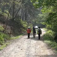 하산후 흙먼지 등을 털어내고 있는 등반객들.