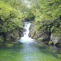 연이어진 폭포의 물줄기는 벼루처럼 매끄러운 암반 사이로 거침없이 내달리며 청량감을 더한다.