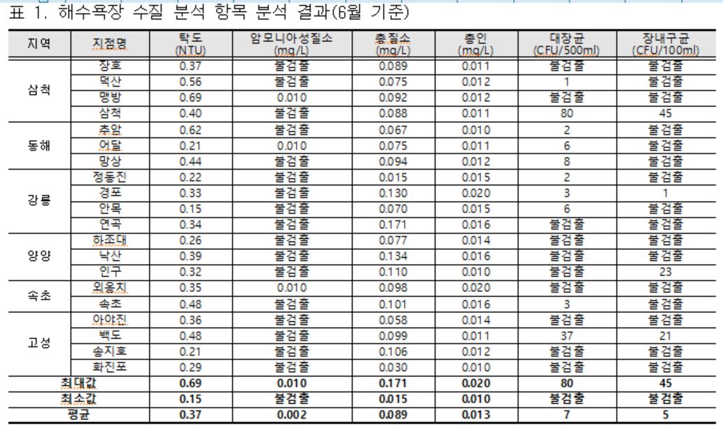 강원도보건환경연구원은 해수욕장 이용객들에게 정확한 환경정보를 제공하기 위해 지난 5~6월 강릉, 동해, 속초, 삼척, 고성, 양양 등 6개 시·군 주요 해수욕장 20개 지점에 대해 수질 및 백사장의 안전성 조사를 실시했다고 밝혔다.